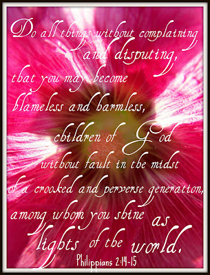 I blew that one today!!! Just what I needed to hear. My day started at the first light of dawn with Buster barking and barking. I yelled as I didn't want to get up. A little later, I got up ---- grumpy, mind you ----- and there, Buster had peed on the carpet, left me another load on the kitchen floor, and the reason???? ----- about 50 buzzards in my backyard and perched on my roof!!!!! I blamed everyone and everything, even though no one was listening to my mouth. I did NOT shine like a light, and IF someone had been there, I don't think I would have been harmelss. Let's try this one again tomorrow morning and see if I get it right!
